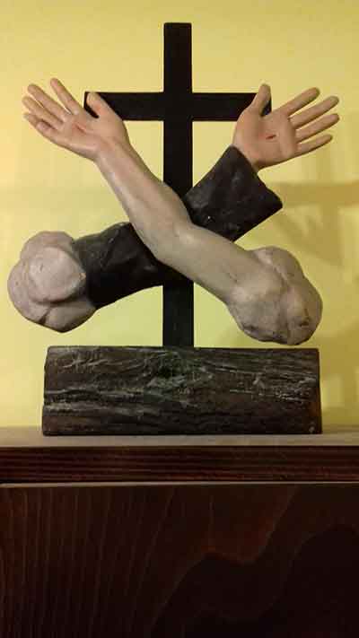 Naturalmente poi, il significato dato sempre all’emblema francescano è quello della “Conformità” di Francesco a Cristo. Esiste anche una grazioso aneddoto che viene invocato per spiegare il perché delle due braccia, uno ignudo e uno vestito. Nel 1213-1214, san Francesco fu ospitato al castello di Susa da Beatrice di Ginevra, moglie del conte di Savoia, Tommaso I. La contessa donò al santo un terreno perché vi sorgesse un convento. In segno di gratitudine, per soddisfare al desiderio della pia benefattrice che gli chiedeva un ricordo, san Francesco si staccò una manica dalla tonaca e gliela donò. Fu così che, durante il lungo viaggio, tutti videro il santo con un braccio ignudo e uno vestito, e così furono benedetti da lui con le braccia in forma di croce. La reliquia esiste ancora ed è venerata nella cattedrale di Chambery, in Savoia.